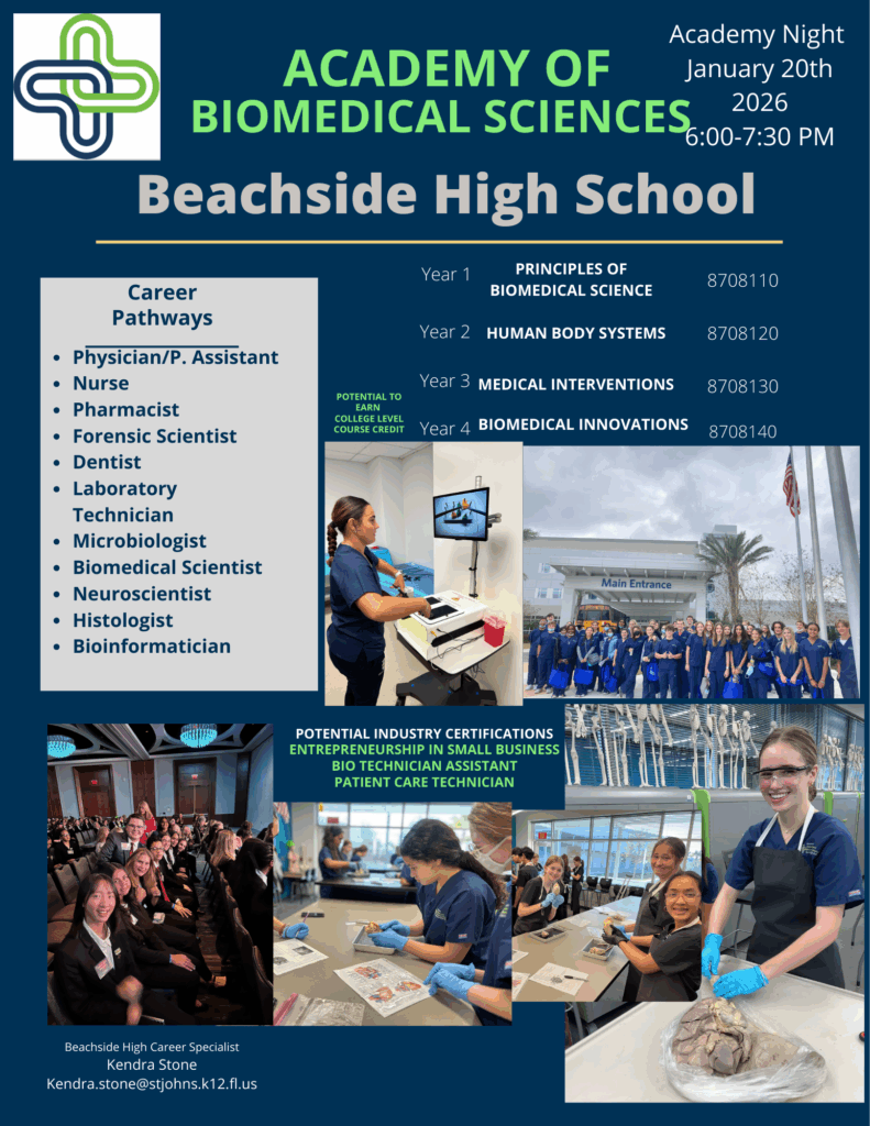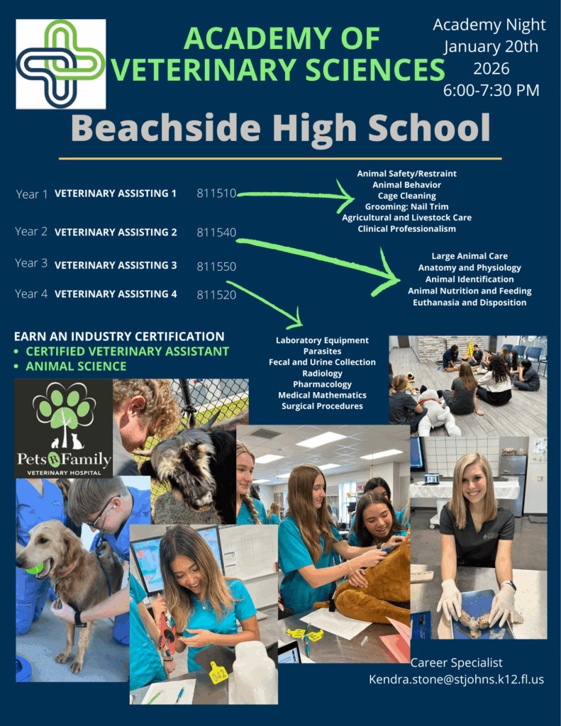 BHS Academy of Veterinary and Biomedical Sciences Contact Kendra Stone, Career Specialist (904) 547-4413 Location 1070 Beachwalk Blvd.Saint Johns, FL 32259Map & Directions